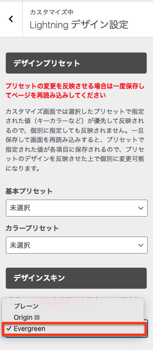 外観 > カスタマイズ > Lightning デザイン設定 の「デザインスキン」から「Evergreen」が選択する事ができます。