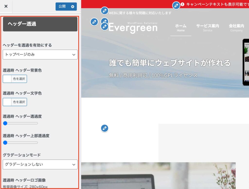 Evergreenのデモサイトの場合、トップページのみヘッダーの透過を有効にしているため、画像はヘッダー部分に重なる形で設置されます。
